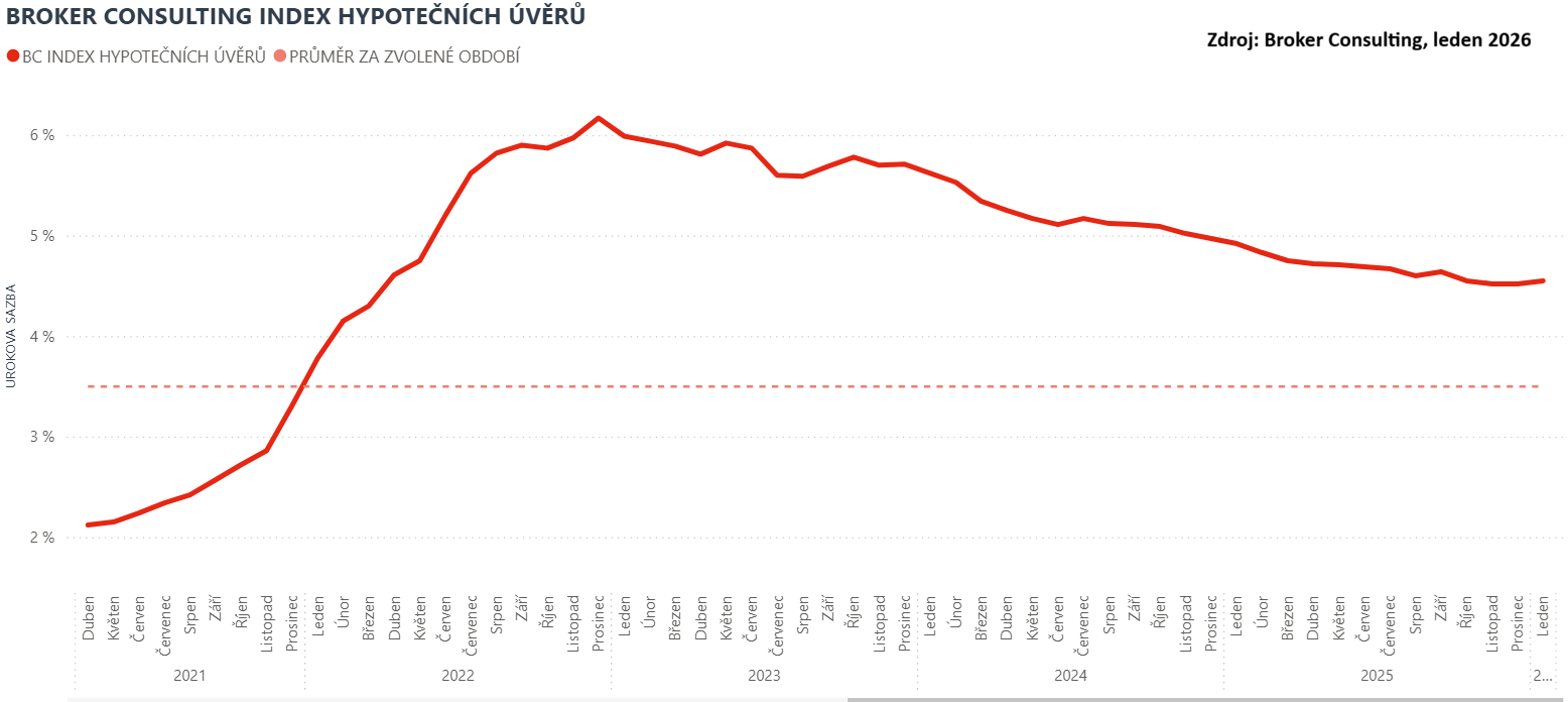 A jak si sazby vedly v průběhu roku 2025? Podle dat Broker Consulting Indexu se průměrná hypoteční sazba zhruba do poloviny roku postupně snižovala – z lednových 4,92 % přes 4,83 % v únoru, 4,75 % v březnu a 4,72 % v dubnu až na 4,60 % v srpnu. V dalších měsících se tempo poklesu zpomalilo a na přelomu roku došlo k mírnému navýšení. Závěr roku se pak nesl ve znamení stabilních sazeb: v říjnu činily 4,55 %, zatímco v listopadu i prosinci se ustálily na úrovni 4,52 %.